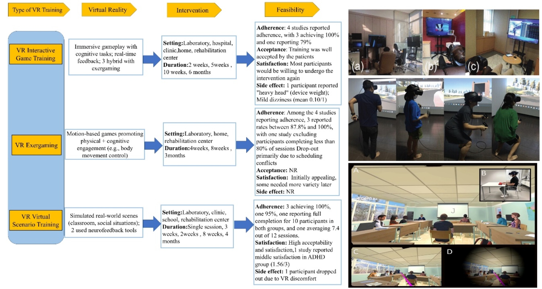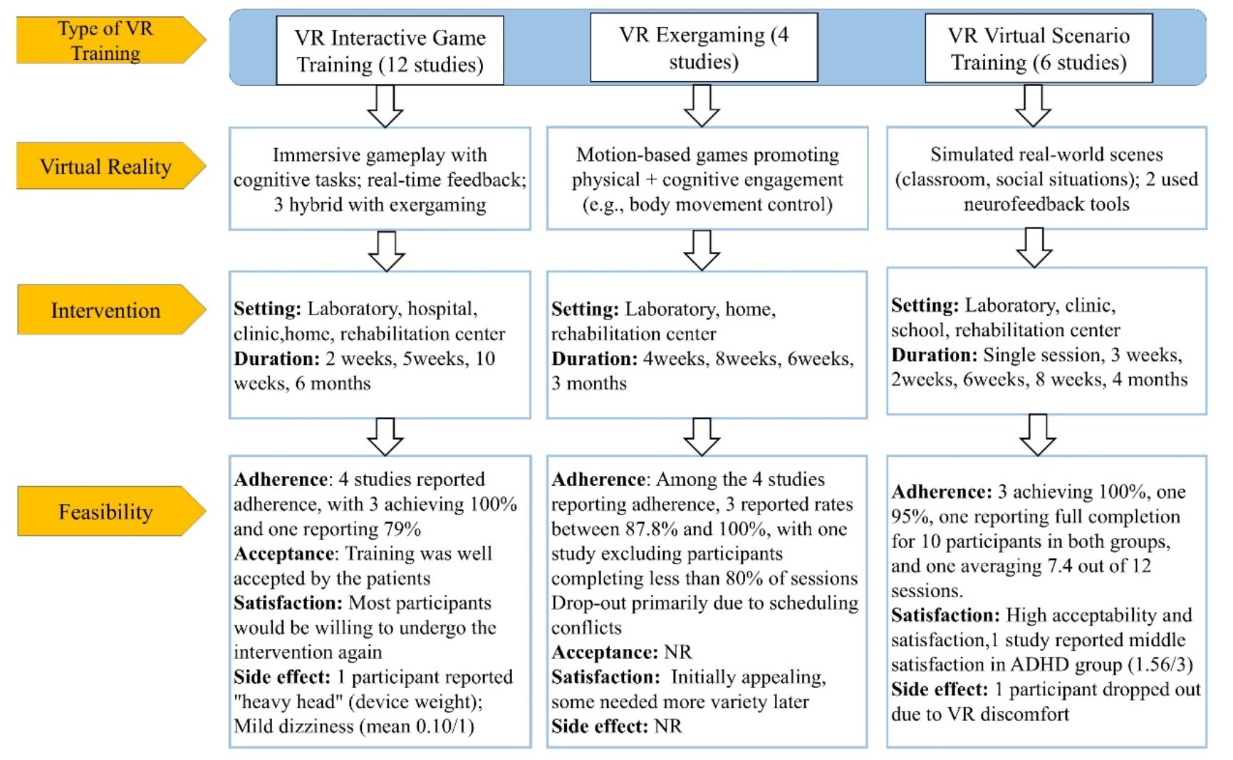 图1. 文献筛选流程图 三大 VR 干预模式各有侧重,形成症状改善互补效应 研究首次将 VR 干预 ADHD 模式划分为三类核心类型,各有侧重且形成症状改善互补效应,均表现出良好的可行性与接受度:VR 互动游戏训练(55%)融合沉浸式游戏与认知任务,聚焦提升注意力、执行功能,是应用最广泛的模式;VR 体感运动训练(18%)结合动作捕捉与身体运动,靶向改善抑制控制、运动协调性;VR 虚拟场景训练(27%)模拟真实生活场景,重点提升情绪调节、社交技能。这三种训练模式在信息呈现方式、交互形式上的本质差异,使其在改善 ADHD 不同症状维度上形成了互补效应