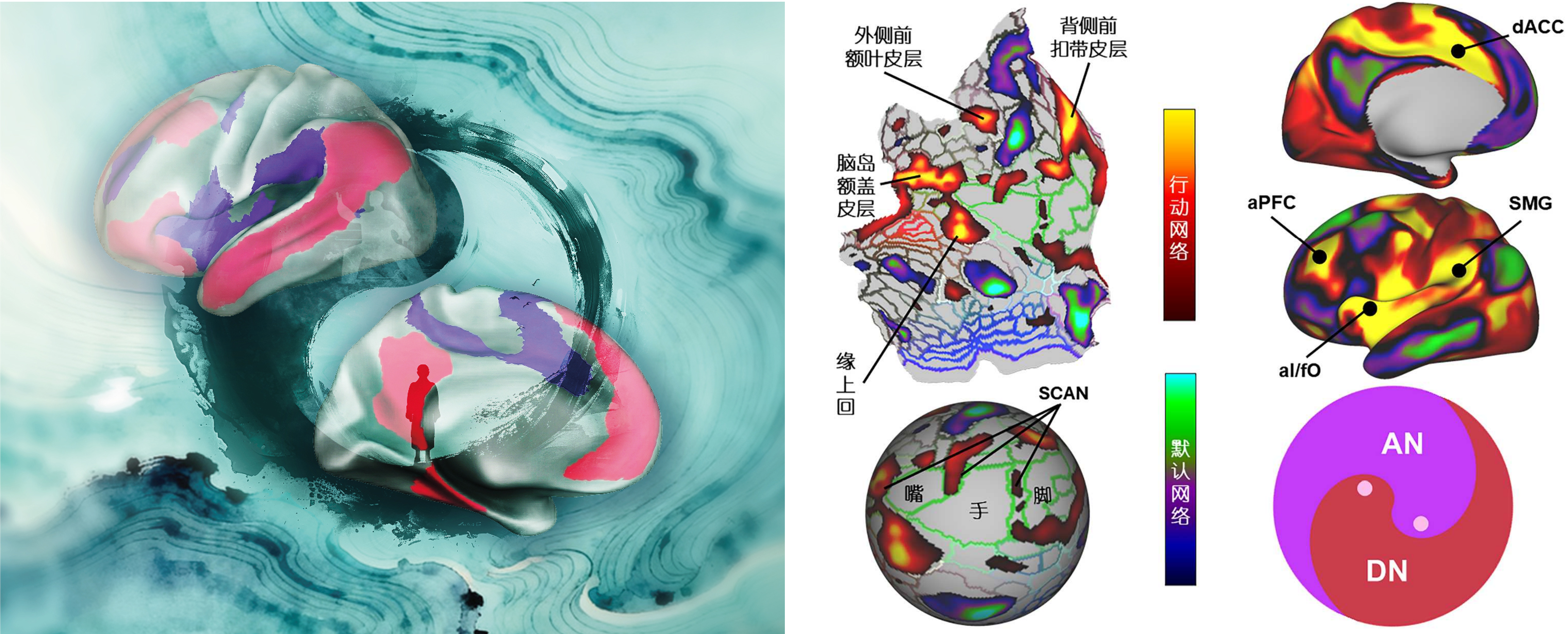 从“默认”到“行动”:大脑功能系统的“阴阳平衡” 大脑在无明确认知任务的静息状态下,并非处于“空闲”状态,而是由一组高度协同的脑区持续活动,形成所谓“默认网络”(Default Network,DN),负责自我反思、记忆整合等内在思维活动。与之相对,当个体需要对外界做出反应、执行目标任务时,大脑则进入“行动模式”。研究团队指出,与这一模式对应的,正是新近被明确界定并命名的大脑“行动网络”。 “行动网络”由前扣带回、前脑岛、缘上回、前额叶等关键皮层区域,以及丘脑、基底节和小脑等皮层下结构协同构成。它在目标导向行为中持续激活,参与注意力调控、运动规划、错误反馈和认知维持等多种高级功能。论文强调,行动网络与默认网络在功能上既相互拮抗又动态统一,形成类似“阴阳太极”般的动态平衡系统,共同维持大脑在“内省”与“行动”之间的高效切换与资源优化分配。 突破“执行控制”传统认知,构建“三维一体”网络体系 过去,行动网络相关脑区常被归类为“扣带岛盖网络”或“执行控制网络”,但功能界定模糊,解剖结构不明。本研究基于上千人规模的高精度成年脑成像数据,清晰绘制出行动网络的全脑功能图谱(上图右),并提出其“皮层-基底节/丘脑-小脑”三维一体的解剖架构。这意味着行动网络不仅局限于皮层,更是一个跨越多个脑区、整合运动、认知与感觉信息的大尺度系统,对于体系化研究人类脑智行为关联奠定了系统基础。 论文进一步指出,行动网络与近年发现的“躯体-认知行动网络”(SCAN)存在强连接,共同协调复杂行为与内脏生理调节,实现“身心合一”的高效行动。这一发现挑战了传统上“认知”与“运动”彼此独立的观点,揭示了大脑在发起和维持目标行为时的多系统整合机制。 为脑疾病研究与类脑智能提供新视角 人脑行动网络的提出,不仅完善了人们对大脑工作模式的理解,也为多种脑疾病的机制研究带来了新思路。例如,在帕金森病、精神分裂症、阿尔茨海默病等患者中,行动网络的功能异常可能与认知减退、动机缺失等症状密切相关。未来,通过调控该网络的活动,或将为相关疾病的干预治疗提供新靶点。此外,行动网络与默认网络的动态平衡模型,也为类脑计算与人工智能的系统设计提供了生物启发式的理论参考,推动构建更高效、更灵活的一般集成理论指导下的信息处理模型。 儿童青少年脑智发育的行动网络机制 本项成果由北京师范大学认知神经科学与学习国家重点实验室牵头,联合复旦大学、浙江大学、香港浸会大学、华南师范大学、杭州师范大学等单位共同完成,左西年教授和赵小虎教授为共同通讯作者,复旦大学附属上海市第五人民医院放射科赵小虎教授为第一作者。左西年团队多年来围绕脑网络发育、功能架构与计算方法开展系统研究,在国际上率先揭示出6-18岁儿童青少年脑智发育成熟的行动网络机制[2,3],本次发表的文章也是其实验室在“人口神经科学”和“脑连接组学”方向上的重要拓展。 研究得到了科技创新2030——“脑科学与类脑研究”重大项目、国家自然科学基金及国家基础科学数据中心等项目支持。论文全脑图谱数据已通过科学数据银行面向国际学术界公开共享。 随着脑科学与人工智能的融合不断深入,人脑“行动网络”的提出标志着人类对大脑功能组织的理解迈入一个更系统、更动态的新阶段。该研究不仅推动学术界重新审视大脑的工作机制,也为未来脑健康评估、类脑算法开发与神经系统疾病诊疗提供了重要的理论基石。 相关工作: 1.赵小虎,陈飞燕,何宏建,周昌松,翁旭初,臧玉峰 & 左西年.(2026).大脑行动网络.科学通报,71(02),433-448. 2.Dong, H.-M., Margulies, D. S., Zuo, X.-N., & Holmes, A. J. (2021). Shifting gradients of macroscale cortical organization mark the transition from childhood to adolescence. Proceedings of the National Academy of Sciences - PNAS, 118(28). 3.Dong, H.-M., Zhang, X.-H., Labache, L., Zhang, S., Ooi, L. Q. R., Yeo, B. T. T., Margulies, D. S., Holmes, A. J., & Zuo, X.-N. (2024). Ventral attention network connectivity is linked to cortical maturation and cognitive ability in childhood. Nature Neuroscience, 27(10), 2009–2020. https://doi.org/10.1038/s41593-024-01736-x