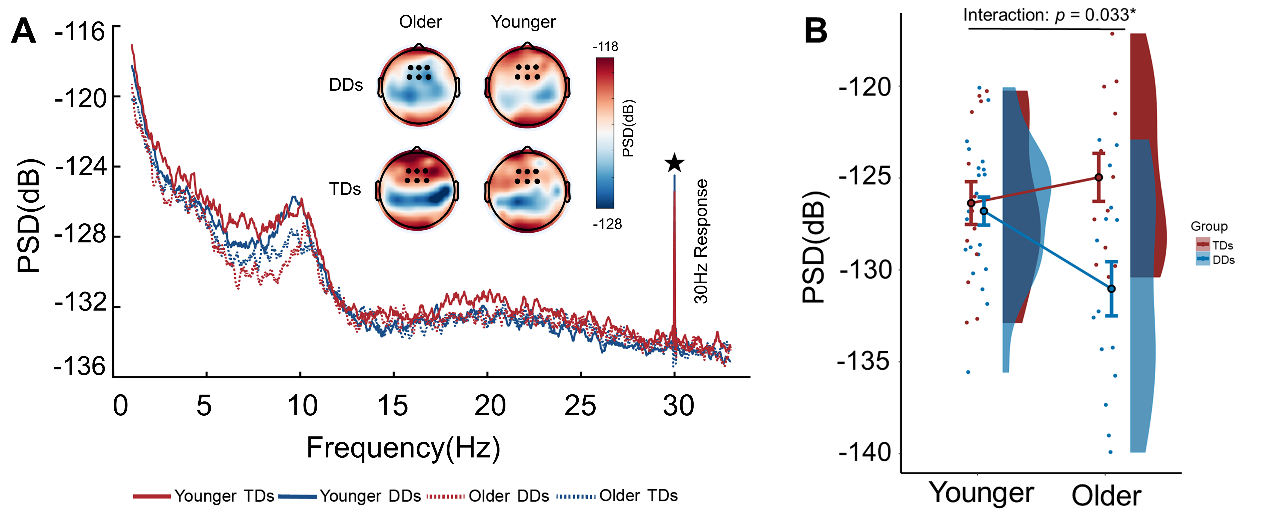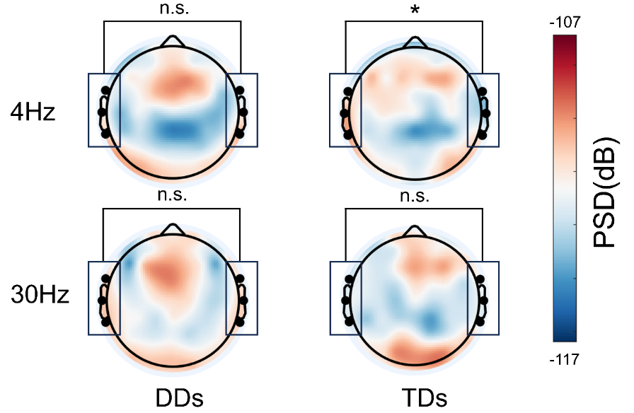 发展性阅读障碍(developmental dyslexia, DD)是学龄儿童常见的学习障碍之一,严重影响个体的学业成就和社会适应。北京师范大学心理学部杨秀杰副教授课题组在心理学顶刊Developmental Science(SSCI一区,中科院心理学大类一区TOP)上发表了题为Atypical Theta and Low Gamma Band Auditory Sampling in Chinese Children with Developmental Dyslexia: An ASSR Study的文章,该研究采用听觉稳态响应(auditory steady-state response, ASSR)脑电范式,首次系统探讨了汉语阅读障碍儿童在大脑神经振荡层面的听觉时间采样缺陷及其与阅读能力的关系。 关于阅读障碍的成因,时间采样框架(temporal sampling framework, TSF)理论认为,阅读障碍的根源可能在于大脑对语音信号的时间采样能力受损。具体而言,大脑通过不同频段的神经振荡来切分语音:theta频段(~4 Hz)负责采样音节信息,而gamma频段(~30 Hz以上)则负责采样音位等精细声学信息。以往研究多关注拼音文字(如英语)儿童,而汉语作为一种非拼音文字,其对声调加工和字形结构有独特要求。汉语阅读障碍儿童是否存在跨频段的听觉采样异常?这些神经指标能否预测汉语阅读技能?这些问题对于理解阅读障碍的普遍性规律至关重要。 研究招募了64名小学儿童,分为汉语发展性阅读障碍儿童(DD组)和年龄匹配的典型发展儿童(TD组),并根据阅读发展阶段分为低年级组和高年级组。实验采用听觉稳态响应(ASSR)范式,记录儿童在被动聆听不同调制频率(4 Hz, 30 Hz)的白噪音序列时的脑电活动,通过对特定频域计算功率(power)来衡量大脑对声音信号的追踪与同步能力。 研究发现,与典型发展儿童相比,阅读障碍儿童表现出非典型的时间采样模式:对于theta频段(4 Hz,对应音节节律),高年级(4-6年级)DD组颞叶皮层的神经反应强度呈现出过度增强的趋势;对于低gamma频段(30 Hz,对应音素节律),高年级DD组额叶区域的神经同步响应显著减弱。 这表明阅读障碍儿童在音节声学尺度和音位声学尺度上的时间采样均存在神经缺陷,进一步延缓了其语音意识的发展。
