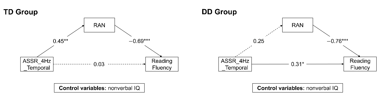 此外,与阅读相关认知能力的关联结果表明,典型发展儿童颞叶4 Hz的神经响应能够通过快速自动命名(RAN)的作用,间接影响其阅读流畅性。相比之下,阅读障碍儿童这种影响路径并不显著,提示其底层听觉加工与高层音节自动化检索之间的链接存在缺失。值得注意的是:TD组儿童在加工4 Hz刺激时表现出显著的颞叶左半球优势,反映了大脑将其作为语言信号进行加工;而DD组儿童则缺乏左侧优势,其大脑可能仅将此类节奏信号视为普通的声学信息,反映了障碍儿童大脑听觉皮层功能组织的非典型性。