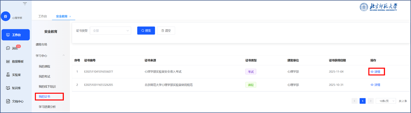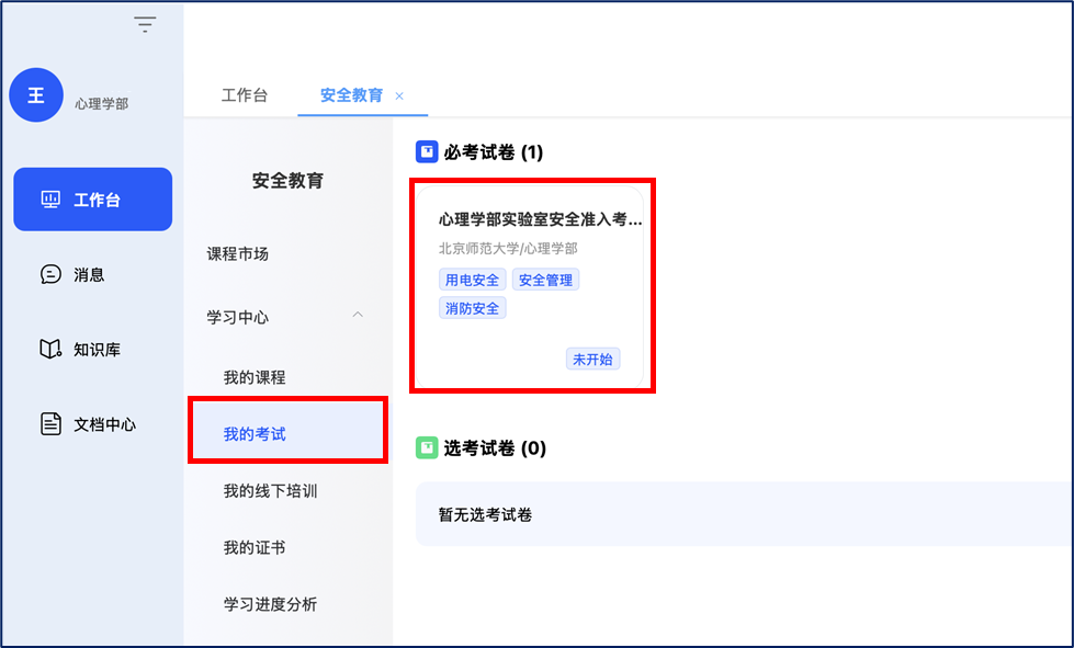 二、实验室准入考核 1.考核方式 在学校安全平台中选择“安全教育”——“学习中心”——“我的考试”下的必考试卷“心理学部实验室安全准入考试”,考试成绩合格标准为90分及以上,未达标可重复考试。考试通过后可在“安全教育”——“学习中心”——“我的证书”中查看考试证书。