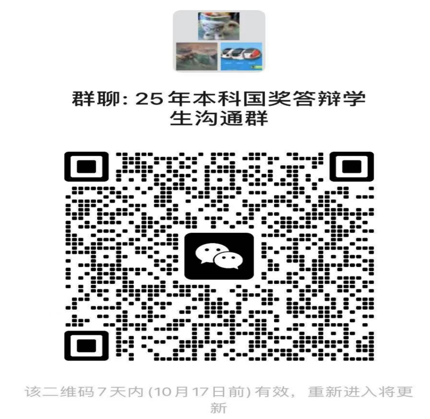 四、注意事项 1、每位同学的自我陈述时间为3分钟(需准备PPT),评委提问5分钟。 2、请所有参加面试的同学提前15分钟找答辩秘书签到,可从开场开始进行旁听; 3、面试当天请自行准备10份个人简历,并在签到时交给答辩秘书; 4、请将面试PPT最晚于10月11日(周六)上午8点前发送至psyxgb@sina.com; 5、请各位同学准时参加面试,如错过面试时间,则视为自动放弃申请资格,之后不再补面; 6、请各位候选同学扫码进沟通群; 7、诚邀心理学部各年级在读本科生前来观摩和学习,相信每位国奖候选人都有各自不同的闪光点和长处,也希望学部更多的同学们能从同学们身上找到适合自己发展的更多可能性。