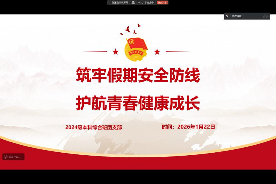 2026年1月22日上午10时30分,心理学部2024级本科综合班团支部于腾讯会议线上开展了以“筑牢假期安全防线,护航青春健康成长”为主题的团日活动。其中团员应到43人,实到28人,请假15人。 首先,参会团员起立奏唱团歌。随后,团支书同学展示了同学们假期中可能涉及的丰富多彩的活动,强调“快乐假期,安全第一”的宗旨。