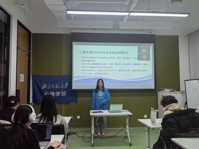 2025年11月6日晚19时30分,由心理学部社会实践部主办的2025年暑期社会实践经验分享会圆满完成,此次会议邀请到了袁艺菲、王业成两位同学作为分享嘉宾,共20余名同学到现场进行观摩学习,同时还开放了线上会议,供线上有相关需求的同学同步学习。本次活动旨在为有意愿参加2026年暑期实践的同学们提供一个积累实践经验的平和一个与优秀实践队员交流经验的机会。为有意愿提升实践能力的同学提供了解暑期实践活动全貌的窗口。 会议开始时,支持人李美林同学向现场同学简要介绍了2025年心理学部暑期社会实践成果概况,同时也简要介绍了袁艺菲、王业成两位嘉宾的实践经历。