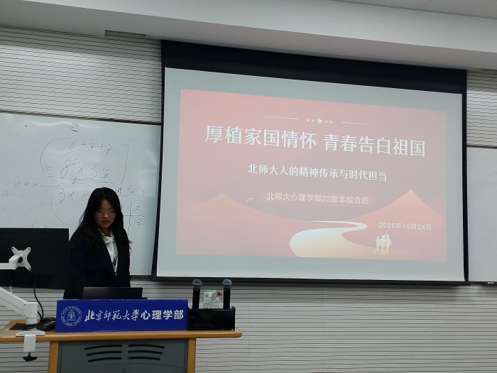 | 2025年10月24日,北京师范大学心理学部2023级本科综合班于金丰和609教室,在团支书赵家慧的主持下成功举办了“厚植家国情怀,青春告白祖国”主题团日活动。本次活动紧扣时代脉搏,深入挖掘北师大“红色师范”的精神血脉,引导青年学子将个人成长与国家发展同频共振,进一步坚定理想信念,勇担时代使命。