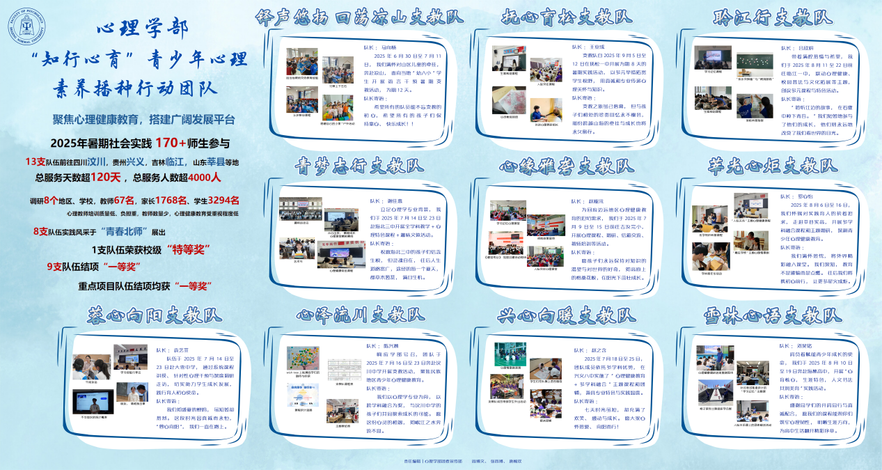 应用心理专硕临床与咨询心理方向实践育人项目风采展示 三、实践育人优秀团队—“知行心育”青少年心理素养播种行动团队 2025年暑期,学部团委组织170余名师生赴全国8个教育欠发达地区开展实践服务,通过“课程教学-主题活动-实地调研-协同反馈”四位一体模式,为4000余名中小学生提供高质量心理教育服务,形成10份基层心理教育调研成果。项目探索出可复制的轻量化基层心理服务模式,相关事迹获《中国青年报》等主流媒体转载报道,总传播量超10万次,实现了社会服务与人才培养的双向提升。