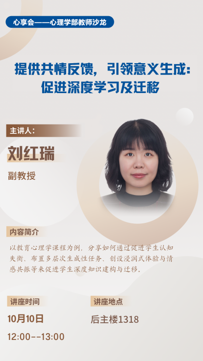 2025秋季学期“心享会--心理学部教师沙龙”活动首讲在心理学部顺利举办。刘红瑞老师以“提供共情反馈,引领意义生成:促进深度学习及迁移”为主题,分享全国教育心理学任课教师培训内容及经验,从价值重塑、任务创新、情感浸润三个维度,系统分享了促进学生深度学习与知识迁移的教学实践路径。学部30余名教师参与活动,现场互动热烈,教研氛围浓厚。 作为长期深耕教育心理学教学与研究的青年学者,刘红瑞老师结合其参与全国教育心理学任课教师培训的前沿内容,围绕如何突破传统教学模式,引导学生实现知识的深度建构与灵活迁移这一核心问题展开分享。她指出,当前高校教学中普遍存在“知识传递与应用脱节”、“学生被动接受而非主动建构”等痛点,而解决问题的关键在于从“教知识”转向“育思维”,通过教学策略创新激发学生的内在学习动机。 刘红瑞老师以教育心理学课程为实践案例,系统阐述了促进深度学习与迁移的核心策略。首先,通过“增价值,破偏见”来唤醒学生的“参与者意识”,帮助学生看见知识的趣味性与可能性。其次,通过“布置生成式任务”,引发学生深层思考,增强知识整合与迁移的意识及能力。最后,通过“浸润与反馈”构建“认知-情感”双驱动的学习环境。 讲座结束后,在场教师围绕“成长型思维”、“共情式积极反馈”、“生成式任务设计”等问题展开热烈讨论。刘红瑞老师结合自身教学经验逐一回应,并强调深度学习的核心是让学生“知其然,更知其所以然,且能迁移其然”,这需要教师在教学过程中既要做“知识的传授者”,更要做“思维的引导者”。 作为“心享会--心理学部教师沙龙”的开篇活动,本次讲座不仅为学部教师带来教学新思路,更通过“理论分享+案例解析+互动研讨”形式,营造互助共学的教研氛围。主持活动的闫琰副书记表示,“心享会—心理学部教师沙龙”是心理学部助力教师专业发展的重要平台,未来将邀请更多专家学者、一线教师分享前沿教学理念与实践经验,推动学部教学质量再上新台阶。 (教务办公室) |