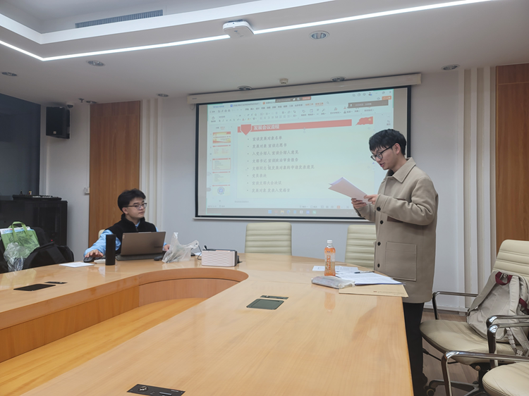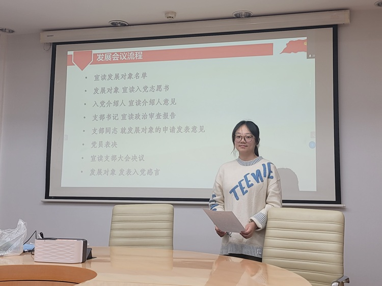 会议开始,党支部全体成员起立,合唱《国际歌》。之后,党支部书记孙梓耀同志对此次党员发展大会的流程以及两位拟发展同志进行了介绍。 首先,潘俊宇同志宣读了《入党志愿书》,详细汇报了自递交《入党申请书》以来在思想政治觉悟和学习工作方面的进步,并表达了继续向党组织靠拢、以党员标准严格要求自己的坚定决心。随后,介绍人宣读了《介绍人意见》,党支部书记孙梓耀同志宣读了《政治审查综合报告》,并提请支部大会讨论。