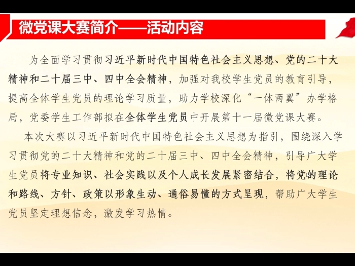 首先,蒋文骥同志介绍了北京师范大学第十一届学生党员微党课大赛的活动内容和比赛安排,同时给出了多项选题建议。本次大赛以习近平新时代中国特色社会主义思想为指引,围绕深入学习贯彻党的二十大精神和党的二十届三中、四中全会精神,引导广大学生党员将专业知识、社会实践以及个人成长发展紧密结合,将党的理论和路线、方针、政策以形象生动、通俗易懂的方式呈现,帮助广大学生党员坚定理想信念,激发学习热情。