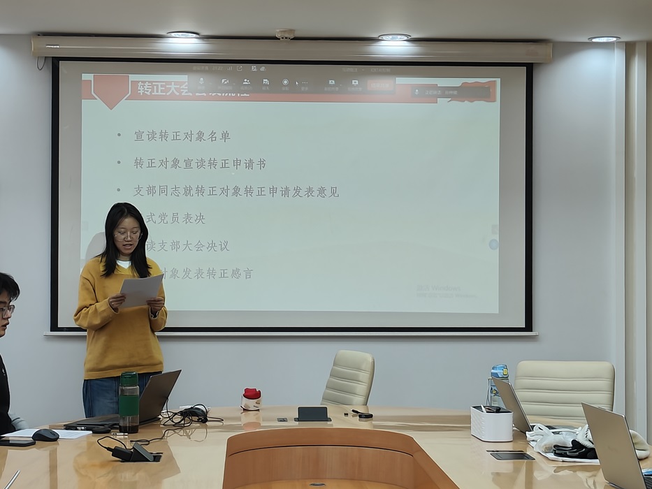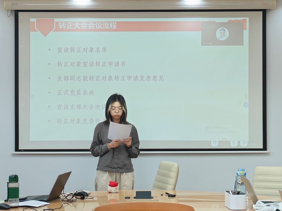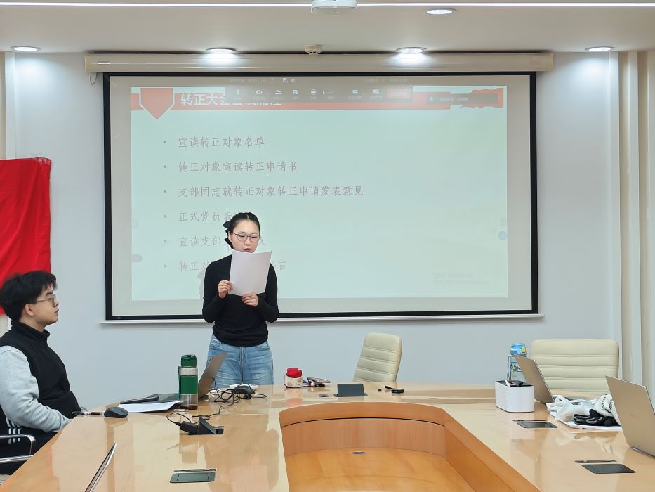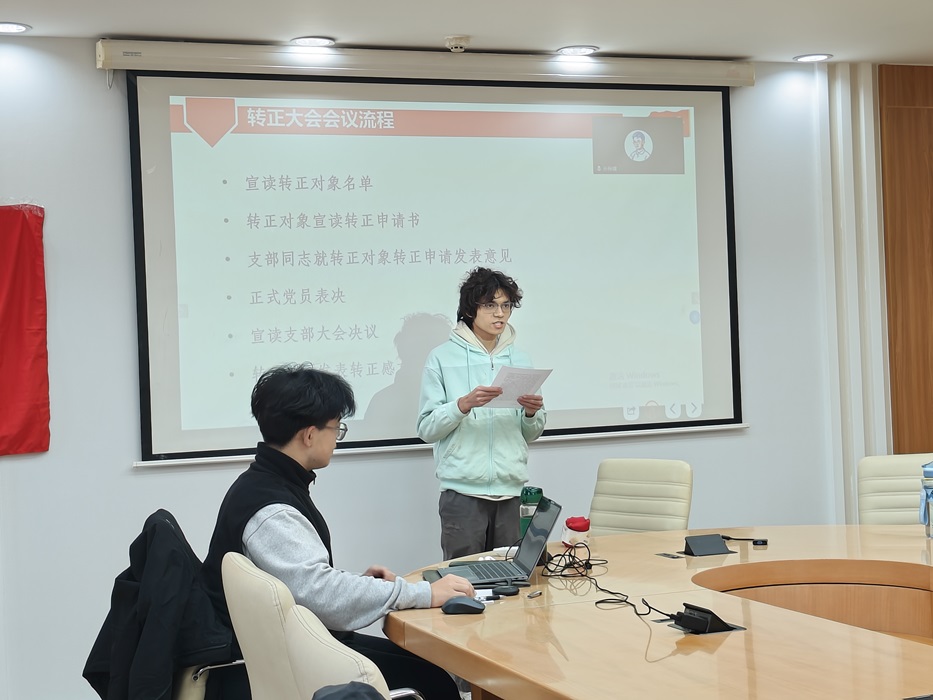 在支部大会讨论环节,孙聪慧同志表示,刘芮孜同学作为学习委员,学习成绩优异、自身表现优秀;在学生工作方面负责任,组织班级活动、完成任务,认为刘芮孜同志已经具备了成为一名党员的条件。沙瑞欣同志也表示,在小组汇报和科研项目中,感受到刘芮孜同志是一个很有想法的人。 党支部全体正式党员进行无记名投票,结果为6票赞成,0票反对,0票弃权。经讨论,支部大会通过了刘芮孜同志的转正申请,同意其按期转正为中国共产党党员。 刘芮孜同志发表感言,按期转为正式党员,深感荣幸。在党组织的培养下,她更加深刻地认识到了党员的使命和肩负的责任,从今以后将更加努力奋斗,不辜负大家的信任。 最后,刘佳仪同志宣读了转正申请。她总结道,过去一年通过系统学习党的历史与理论,理想信念更加坚定;在专业学习上不懈努力,综合素质显著提升;作为学生骨干,她积极履职,热心为集体服务。