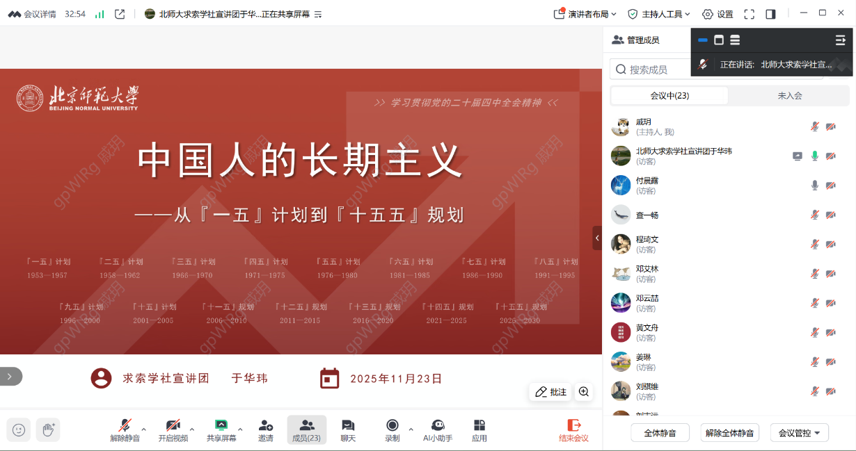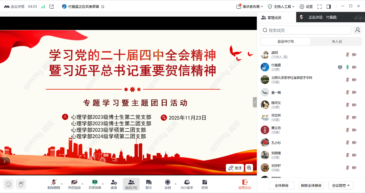 2025年11月23日晚9:00,心理学部2023级博士生第二党支部、2023级博士生第二团支部、2023级学术硕士第二团支部和2024级学术硕士第二团支部于线上联合开展党的二十届四中全会精神和习近平总书记重要贺信精神专题学习活动,本次学习共有24位同学参加。