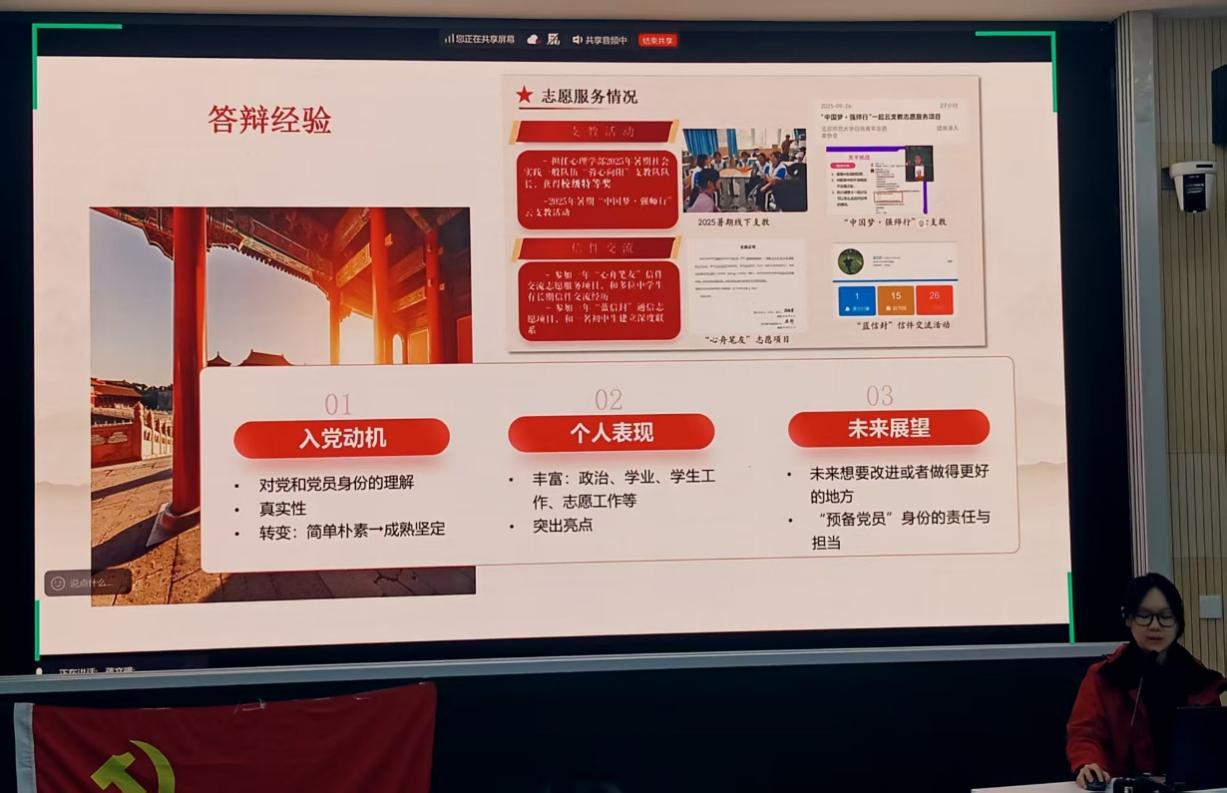 活动还邀请优秀预备党员袁艺菲同志分享发展经验。她从发展流程、笔试准备、答辩要点和个人成长四个方面进行了系统梳理与经验交流,结合自身经历详细讲解了入党过程中的关键环节和注意事项。