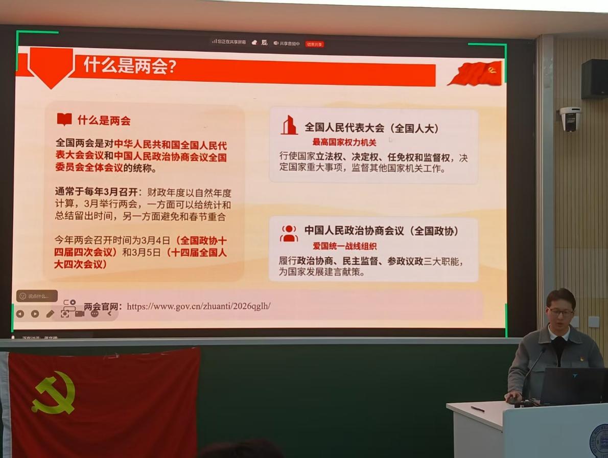 在时政理论学习环节,支部围绕两会专题开展系统学习。主持人蒋文骥同志首先对两会的基本概念、代表产生机制及会议议程进行介绍,帮助同志们准确把握我国政治制度运行的基本逻辑。