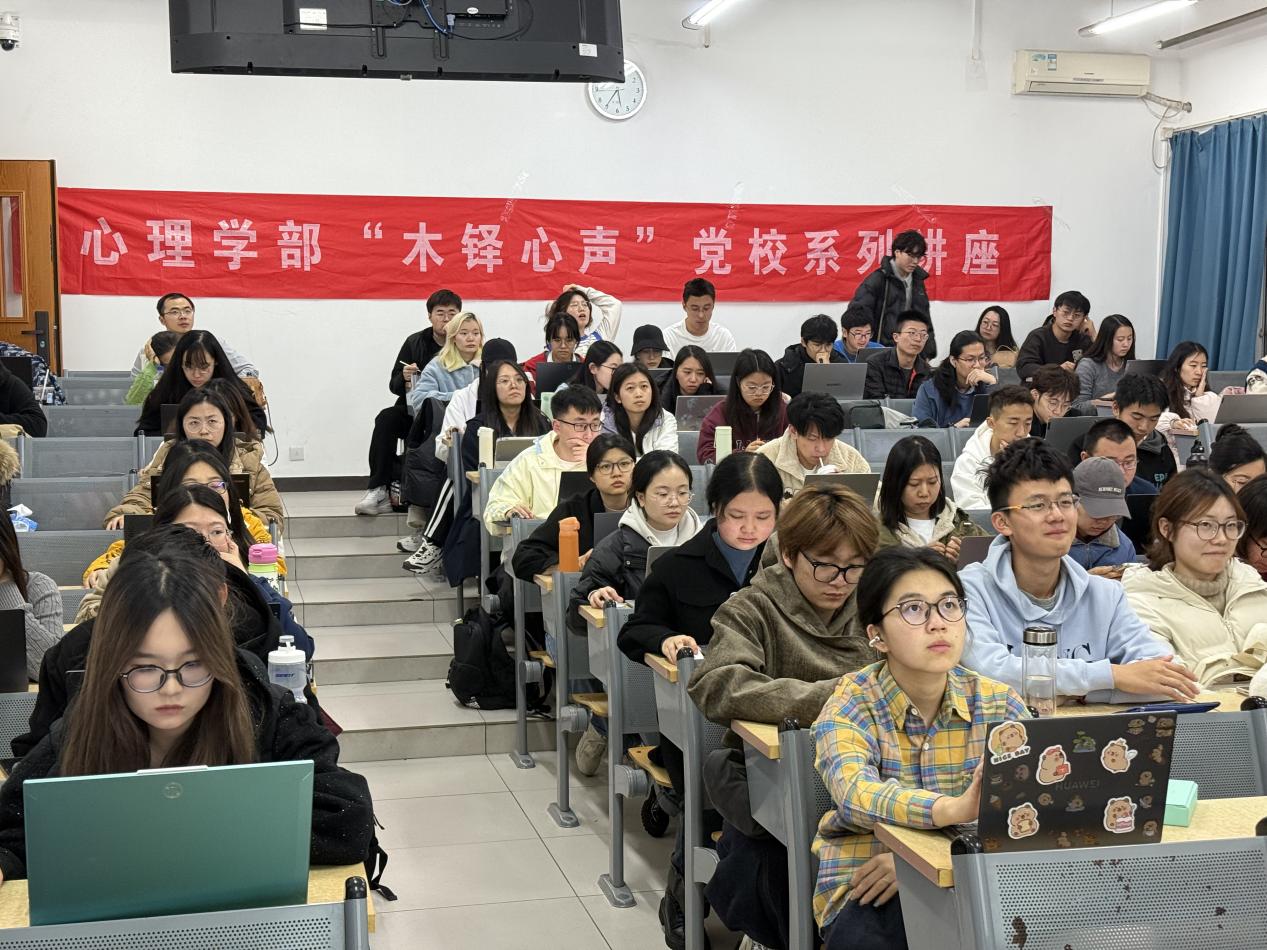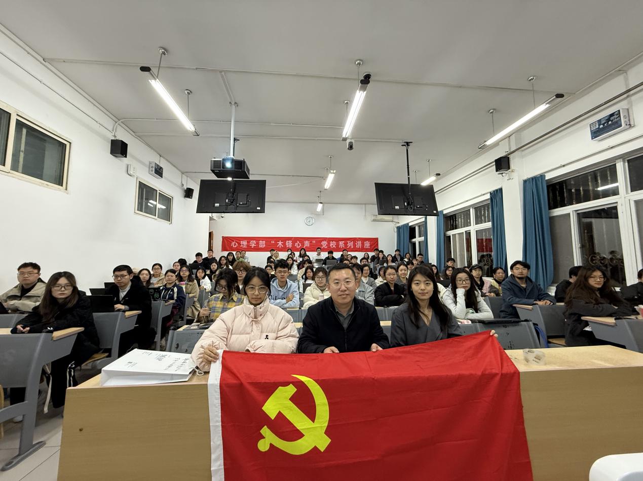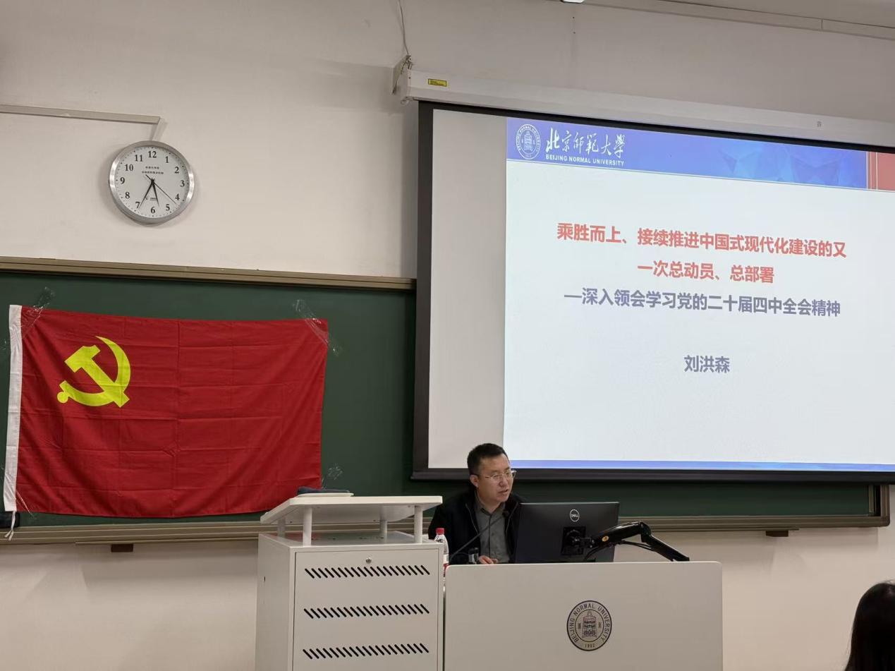2025年10月29日17时30分,2025-2026学年秋季学期心理学部“木铎心声”党校主题讲座——《乘胜而上、接续推进中国式现代化建设的又一次总动员、总部署——深入领会学习党的二十届四中全会精神》成功举办。此次讲座由心理学部党委主办,心理学部2025级学术硕士党支部承办。本次讲座邀请了马克思主义学院刘洪森教授作为主讲嘉宾,来自心理学部百余名师生党员和入党积极分子参加。