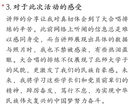 接着,生命科学学院团委书记唐如春为我们带来了名为《在历史回望中唱响未来》的主题宣讲,深情回顾90名北师大学生从零基础到最终于天安门广场致敬历史、献礼和平的117天艰苦训练过程。其中让我们感到敬佩的是,北师大合唱团中每位同学的训练时长均不少于240小时,除了极特殊情况外无人请假,彰显了北师大学生的良好风貌,更展现了中国青年的坚韧与坚定。