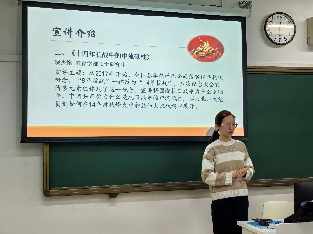 随后,教育学部硕士研究生饶少旗为我们带来了名为《十四年抗战中的中流砥柱》的主题宣讲。通过列举史实,饶师兄深入分析了抗战时间由八年改至十四年的原因,深刻阐明了为什么中国共产党是抗日战争的中流砥柱。在此次宣讲中,我们更加全面地理解了抗战中中国共产党发挥的重大作用,对于抗战精神也有了更加切实的感悟。