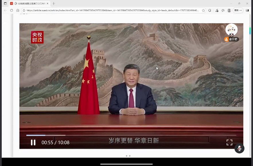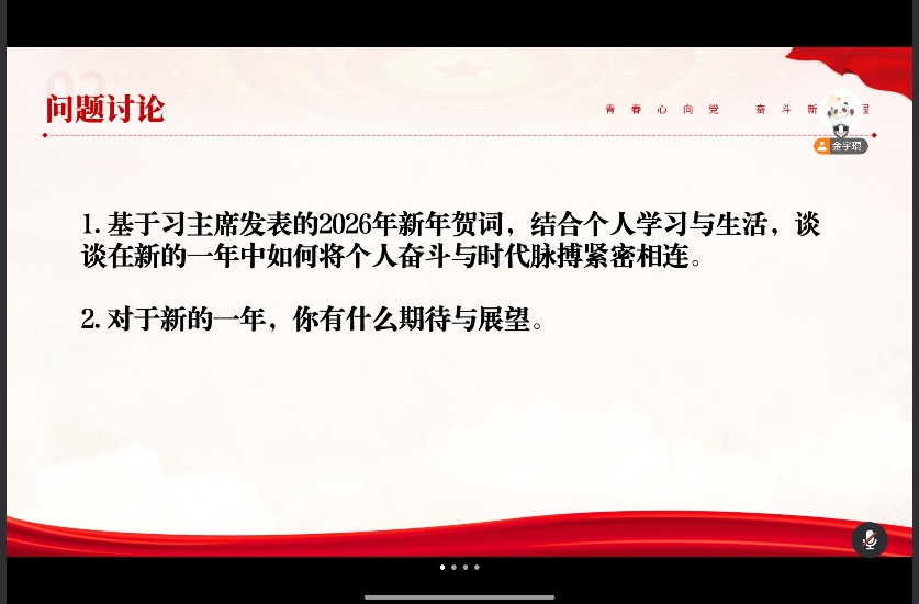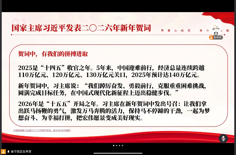 接下来,团支书金宇琨带领全体团员深入学习了习主席新年贺词的主要精神。团员们一同回顾了过去一年祖国发展进程中取得的各项成就,深刻感受到国家发展的强劲活力,也进一步认识到身为新时代青年所肩负的责任与使命。