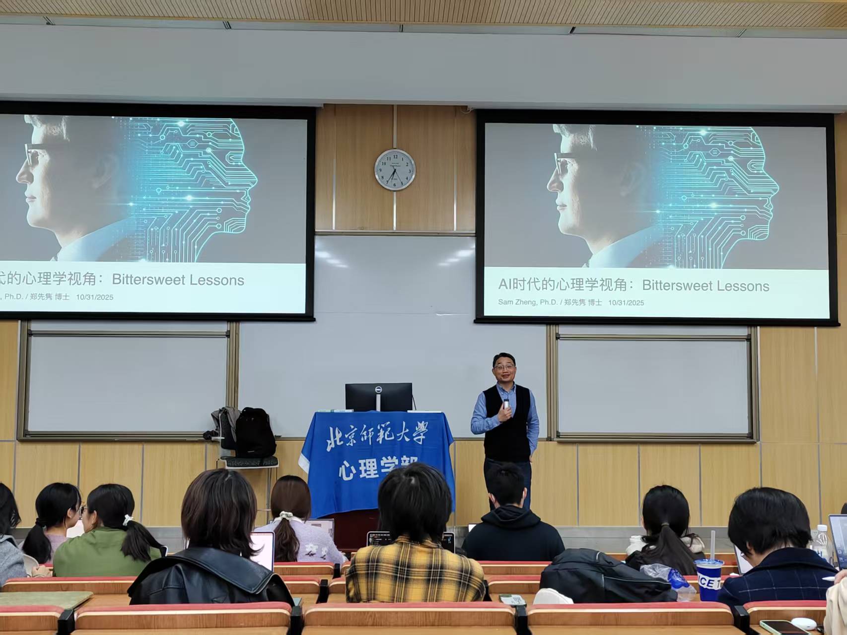 2025年10月31日晚,由心理学部学生会学业部、心理学部研究生会、人工智能学院研究生会共同组织举办的“AI时代心理学视角:Bittersweet Lessons”的Face to Face讲座活动在生一教室如期举行。
