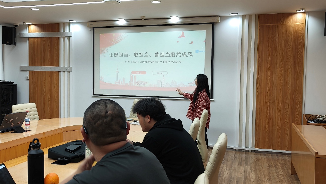第三党小组于3月29日下午在后主楼1316研讨室召开党小组会,深入学习《求是》2026年第5期习近平总书记重要文章精神。党小组长李美林同志主持会议。周琳怡同志围绕“担当”主题,从为何强调担当、什么是担当、怎样担当三个层面进行领学。在自由讨论环节,同志们结合入党动机、身边党员事迹、日常学习实践等分享了担当精神的深刻感悟,表示要将担当精神内化于心、外化于行,在关键时刻挺身而出,在平凡岗位上履职尽责,切实发挥党员先锋模范作用。