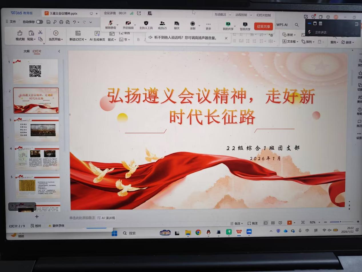 2026年1月22日,北京师范大学心理学部2022级综合1班团支部线上举行了团日活动,主题为“弘扬遵义会议精神,走好新时代长征路”。会议由团支书张溢菲主持,支部13名团员全程参与。