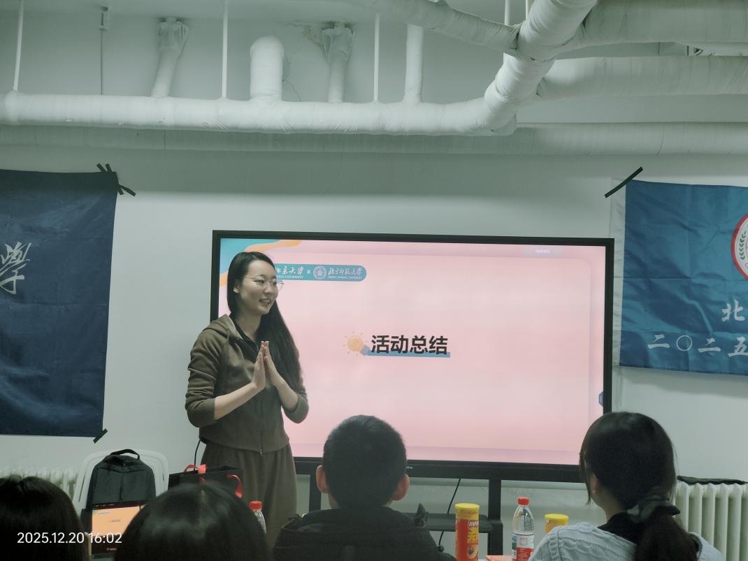 宣讲结束后,进入班级交流环节。首先由北师大心理学部2025级综合班团支部与励耘班团支部班长共同介绍班级建设情况、学科特色及发展规划;随后,北京大学2025级临床7班班长详细介绍了其班级的专业优势、学习氛围及活动开展情况。双方班级的介绍增进了两校不同专业学生之间的相互了解,为后续交流奠定了坚实基础。