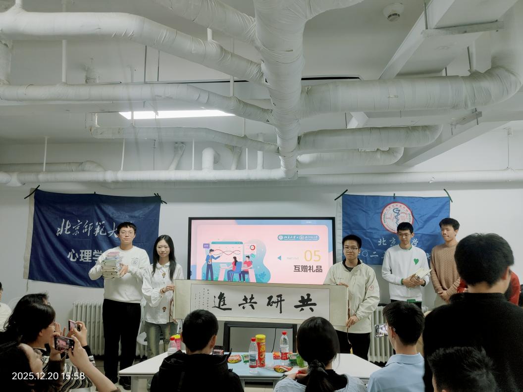 活动接近尾声,两校班级举行了温馨的礼品互赠仪式,传递跨校情谊。北师大心理学部2025级综合班和励耘班团支部精心准备了带有北师大校徽与校训的文创笔记本,寓意“笔墨传情,共悟初心”;北京大学2025级临床7班则回赠了一幅由班级同学亲笔书写的“共研共进”书法作品,寄托了两校学子携手深耕专业、共同成长进步的美好愿景。礼品互赠后,北师大25级心理学部综合班&励耘班辅导员齐惠紫老师与北京大学25级临床7班辅导员陶朱老师分别对整场活动进行总结,两位辅导员的发言均聚焦跨专业交流与专业深耕,强调跨校跨专业的联动正是推动学子深耕专业、拓宽视野的重要途径,为成长提供了新视角!