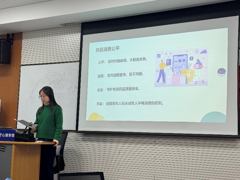 2026年3月19日晚21时,心理学部2024级本科综合班于金丰和609举办“关注消费权益,共促社会公平诚信”的主题团日活动。应到43人,实到33人,请假10人。 活动伊始,团支书陈嘉祺以讲解分享的形式,带领全体团员认识国际消费者权益日的起源与发展。团员们重点学习了今年“3·15”的核心词“公平、诚信、安全、共享”的内涵,对价格歧视、大数据杀熟、虚假宣传等消费乱象有了清晰的认知,深刻理解了消费公平是社会公平的重要缩影。