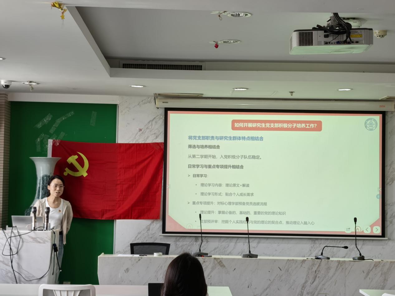 孔小杉同志介绍了积极分子培养工作中使用的“党支部职责与研究生群体特点相结合”“筛选与培养相结合”“日常学习与重点专项提升相结合”三个经验,帮助支部积极分子有高质量的发展。