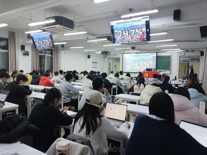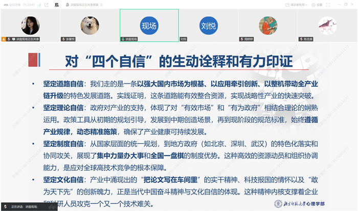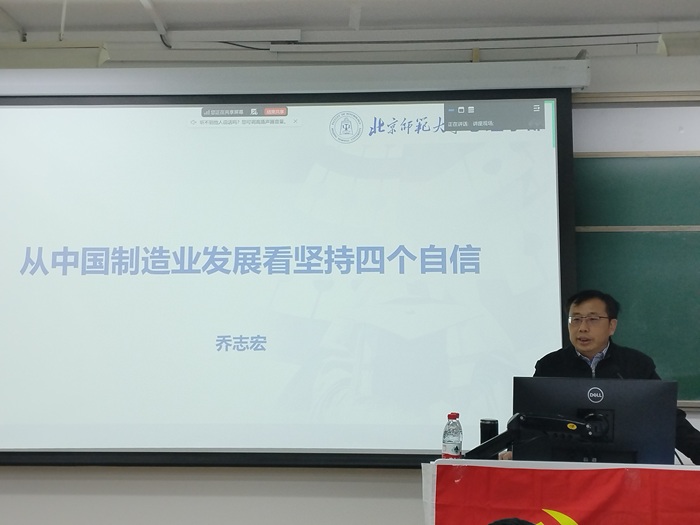 2025年12月18日18:30,2025-2026学年秋季学期心理学部“木铎心声”党校第三场主题讲座《从中国制造业发展看坚持四个自信》成功举办。此次讲座由心理学部党委主办,心理学部本科生第一党支部承办。本次讲座邀请了北京师范大学心理学部党委书记乔志宏教授,由赵家慧同志主持,来自心理学部、环境学院、中国基础教育质量监测协同创新中心的百余名党员和入党积极分子参加。