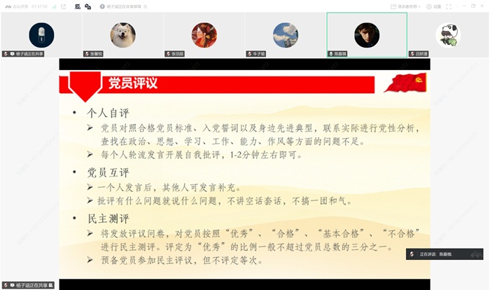 会议内容第二项,党员及预备党员进行民主评议。党员评议分为个人自评、党员互评、民主测评三部分。首先,党员及预备党员联系实际进行党性分析,全方位查找自己存在的问题和不足,轮流进行自我批评。接着,其他同志结合实际,向发言者提出问题或发言补充。最后,杨子涵同志发放评议问卷,在场同志对支部内全部正式党员进行了等级评定。同志们结合过去一年的思想与实践,深入剖析了自己的不足之处。有的同志表示自己由于毕业论文、日常学业等任务繁重,对支部内的部分活动有所忽略,日后应不断加强党性修养;有的同志反思,自己在工作上有时放不开,循规蹈矩,按部就班,缺乏主动性和创造性,需要进一步增强创新意识,优化工作流程。