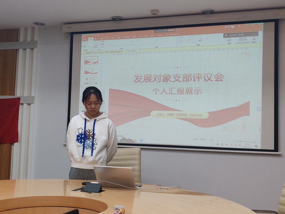 程先楷同志首先阐述了评选规则和评选流程,要求与会党员站在党的事业后继有人的高度审慎做出评分。随后,刘骐维、汤佳怡、刘馨泽、李佩玲等4位同志逐一上台答辩,分别介绍自己在入党动机、学业与工作表现等方面的实际情况。