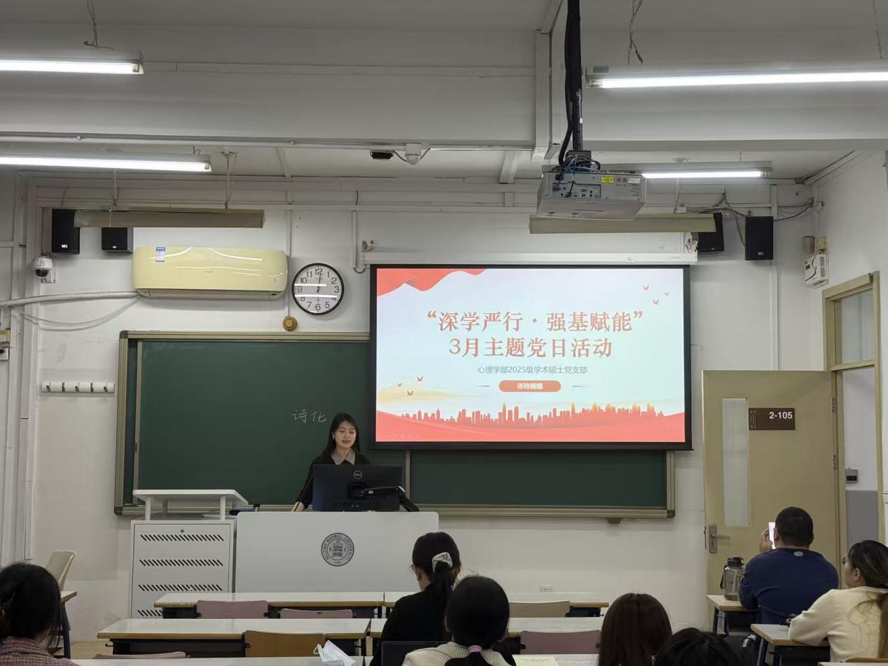 2026年3月26日18时,心理学部2025级学术硕士党支部于教二楼105顺利开展本月主题党日活动。会议由党支部书记许玲瑞娜同志主持。支部21位正式党员和16位积极分子到场参会。