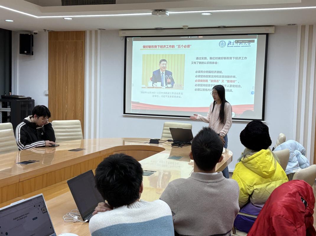 2025年12月13日晚,2024级心理学师范班于后主楼1316顺利开展主题为“‘放得活’与‘管得好’——解码高水平社会主义市场经济体制”的团课学习。本次团课学习采取线上线下相结合的形式,共29名团员参与。 首先,团支书周若男同志主持并带领全体团员齐唱团歌。