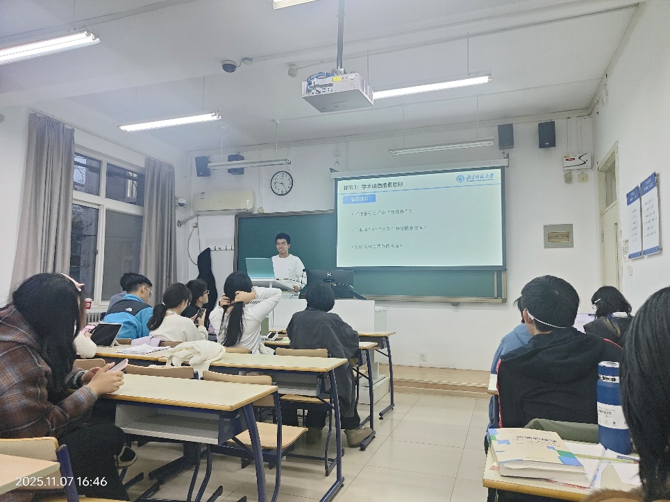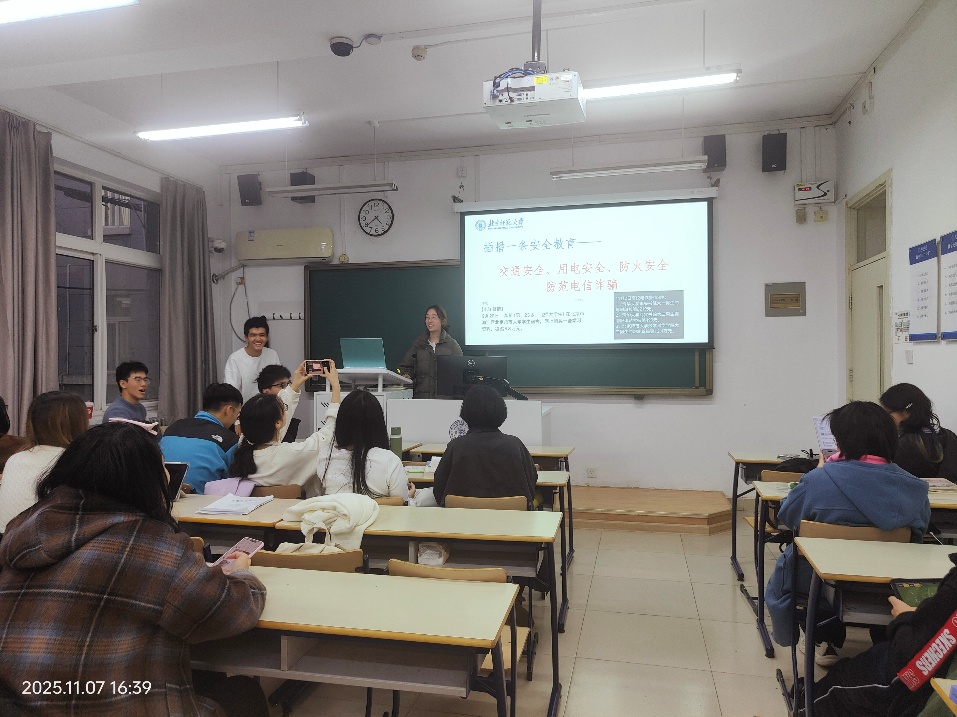 2025年11月7日,心理学部2025级综合班、励耘班召开了“学海航行,诚信为帆”主题班会。班会由综合班班长方雲舒、励耘班班长陈朗文共同主持。 班会开始前,方雲舒同学插播了一条安全教育,提示同学们注意交通安全、用电安全、防火安全,谨防电信诈骗,并以令人痛心疾首的新鲜案例作为警示,提高了同学们的安全防范意识。
