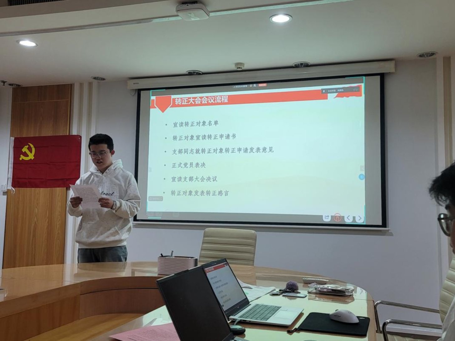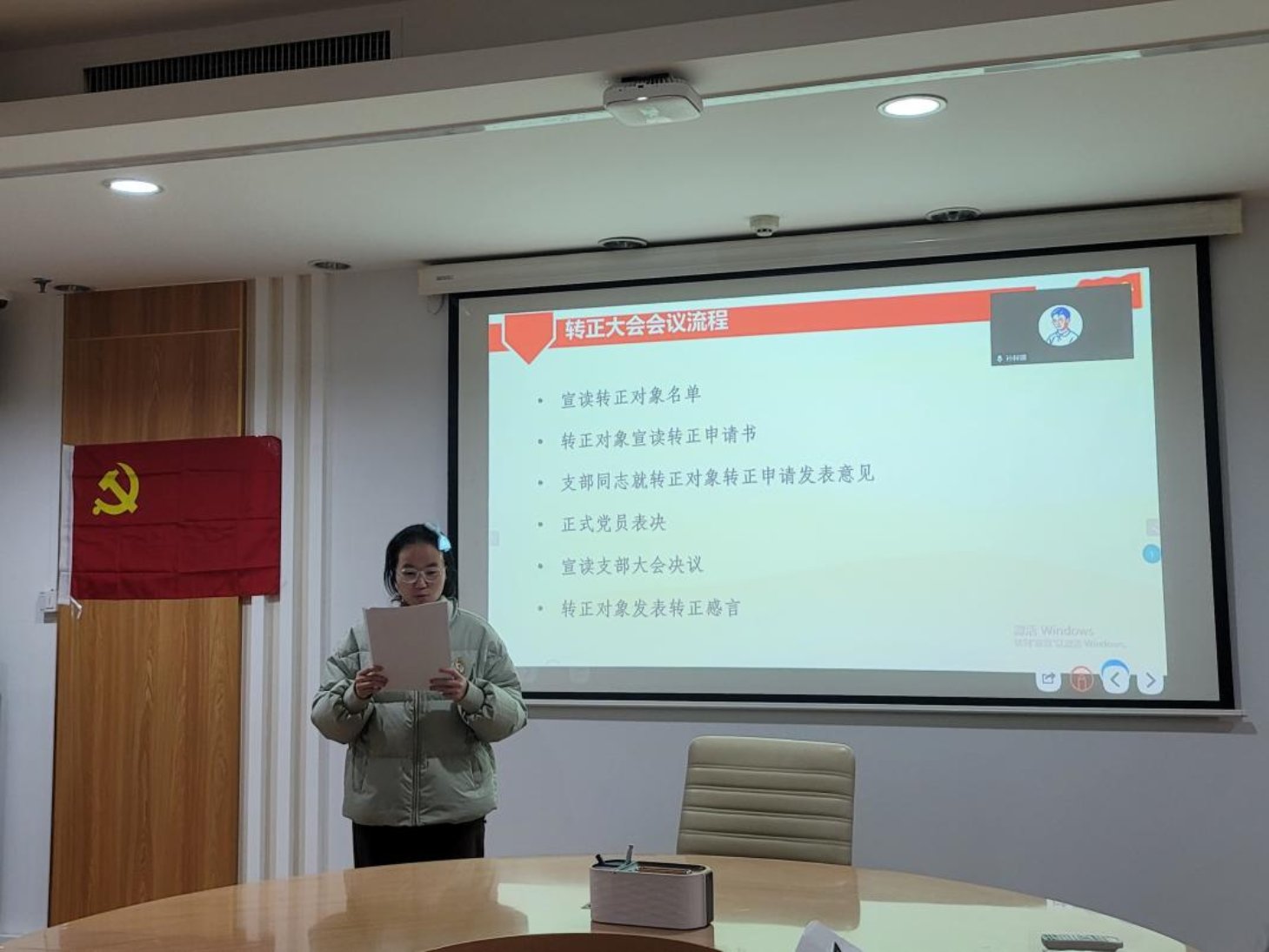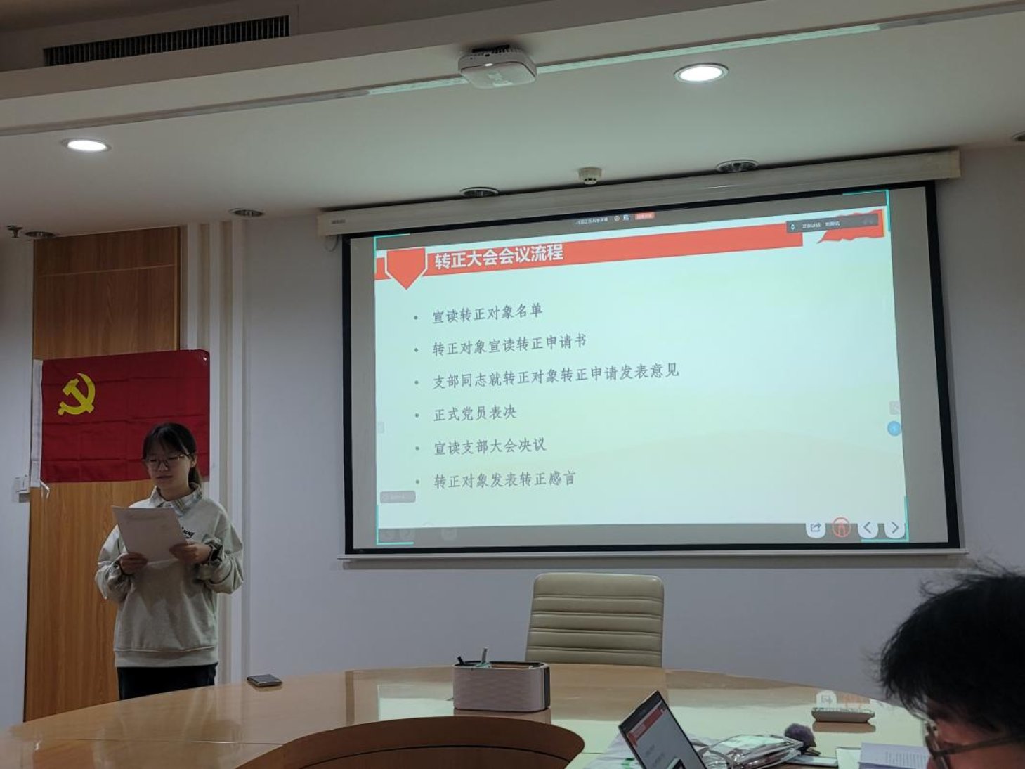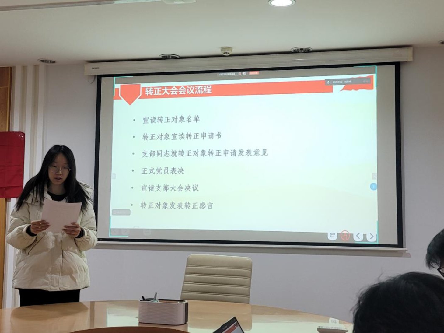 接着,孙聪慧同志宣读了《转正申请书》,向党组织汇报自己在预备期内的成长与收获。该同志注重政治建设与理论修养,系统学习党的重要理论文本,深入领会相关精神要求,强化纪律规矩意识与责任使命,政治觉悟显著提升。学习上,她勤勉刻苦,综合表现优异,荣获京师二等奖学金、校级“三好学生”,积极参与科研实践,完成国家级双创项目结项,申报市级 “启研” 计划,发表研究综述,还获得本校研究生推免资格。工作中,她担任班级班长和支部第一党小组小组长,履职尽责,搭建师生沟通桥梁,高质量开展党小组工作,组织特色活动,锤炼了综合能力。