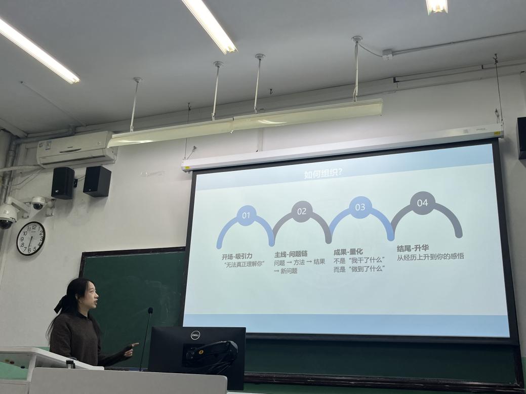 分享过程中,金卓然师姐针对答辩的开场——主线——成果——结尾四个方面分别展开了讲解,分享每个板块背后的设计技巧,并强调:“你的独特性会让你脱颖而出”,在场同学频频点头,活动后表示受益匪浅。
