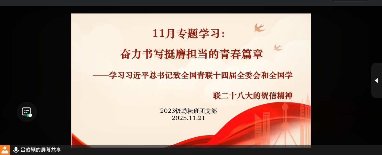 2025年11月21日7点,2023级励耘班团支部召开了“奋力书写挺膺担当的青春篇章”的线上专题学习,深入学习了习近平总书记致全国青联十四届全委会和全国学联二十八大的贺信精神。