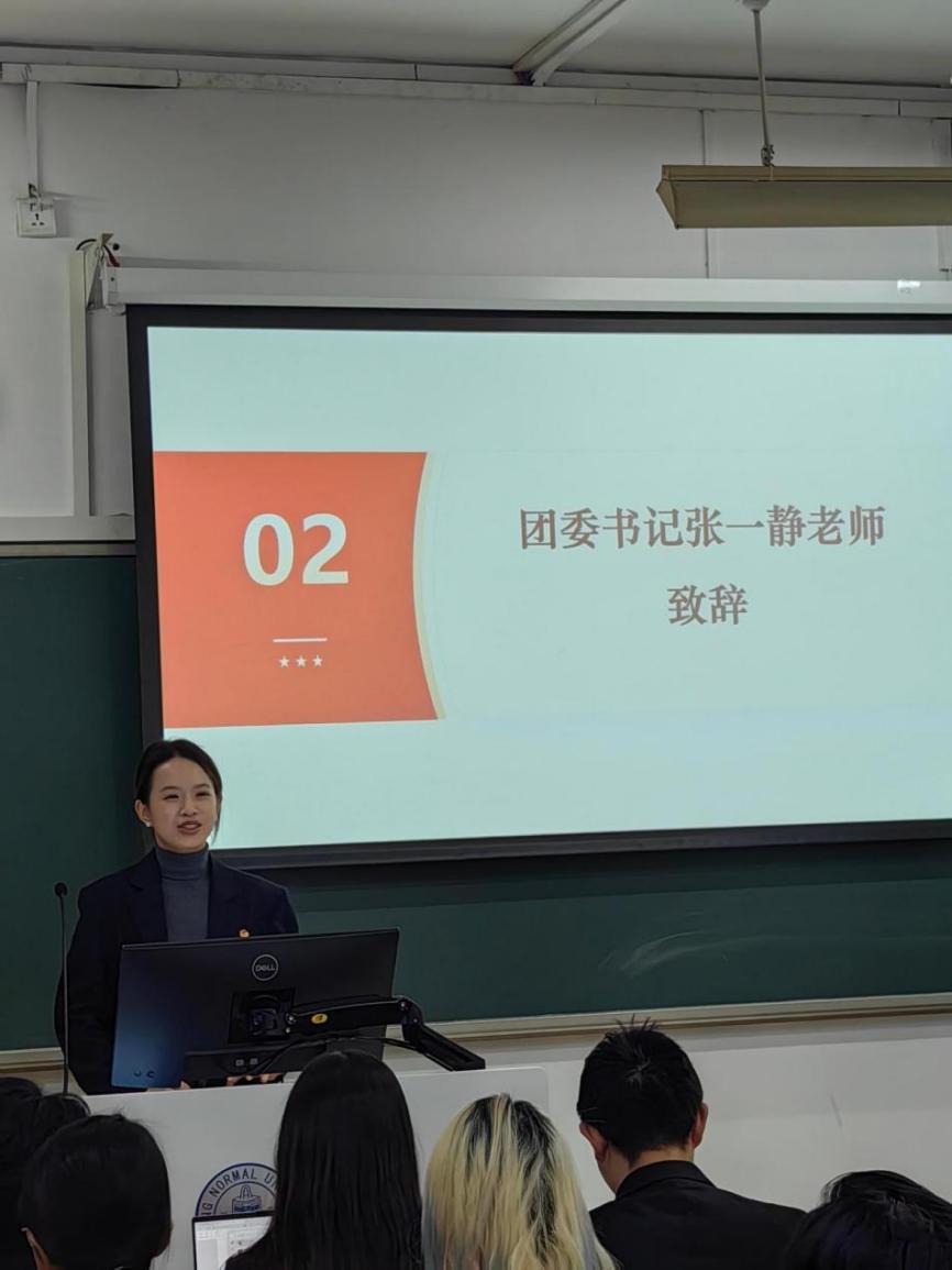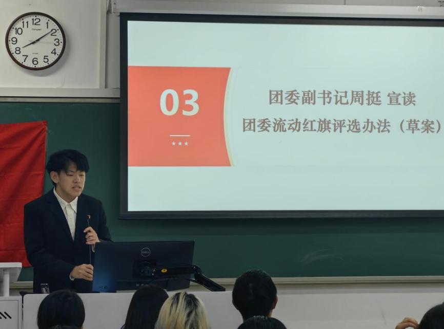 图3 团委书记张一静老师致辞 接下来,团委副书记周挺宣读团委流动红旗评选办法(草案),明确了评选标准与流程。各部门部长按现场抽签顺序依次上台进行工作汇报,由团委书记团提问,全体与会成员打分,确保客观公正。