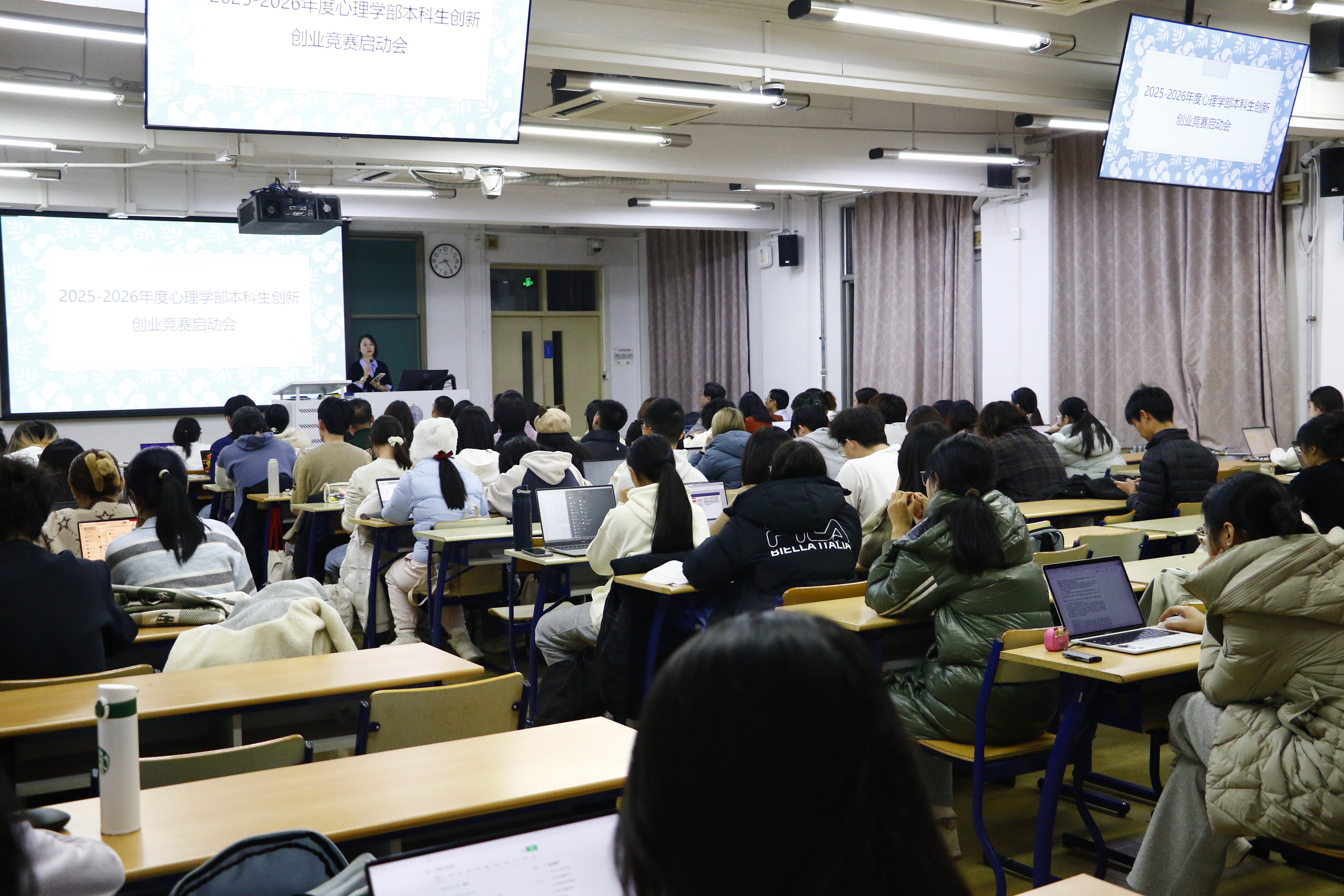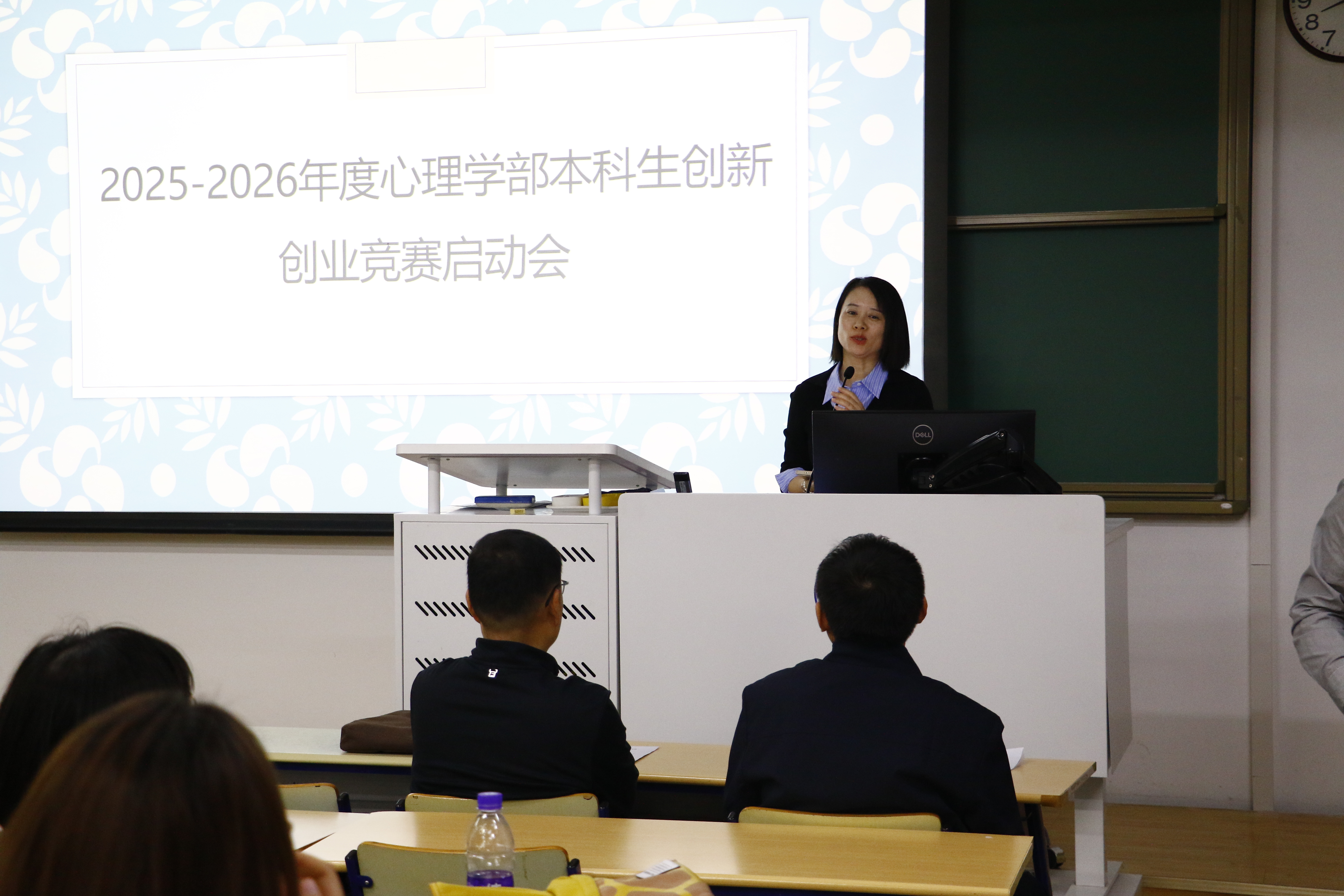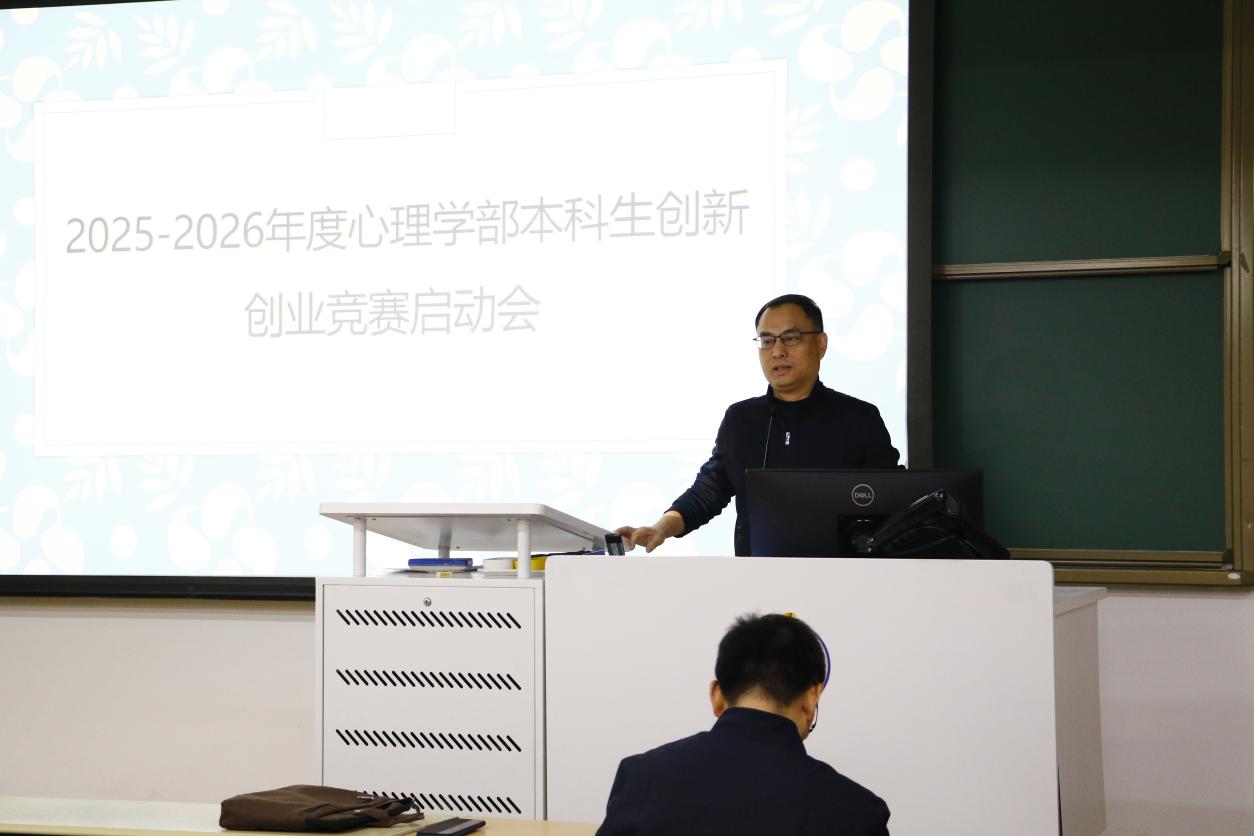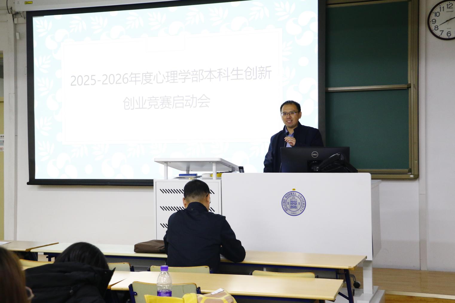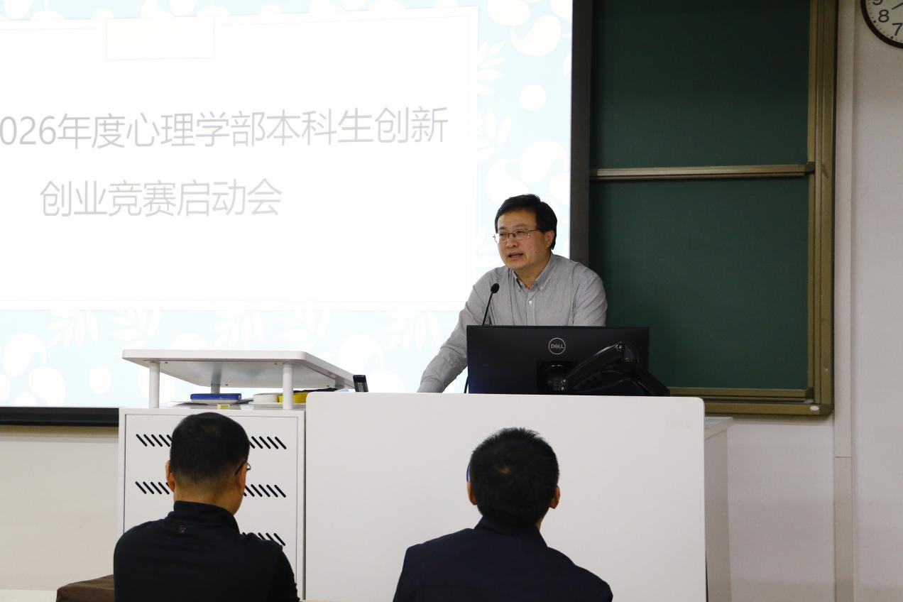 启动会于当晚20:00在教二301教室如约而至,计划参赛及关注赛事的学子座无虚席。本次启动会由心理学部本科人才培养团队骨干左西年教授主持,学校教务部培养处窦非处长与心理学部罗良部长相继登台致辞寄语,强调双创竞赛在锻造科研能力、实践转化与团队协作中的独特价值,勉励同学们立足专业特色、勇闯跨学科创新蓝海。