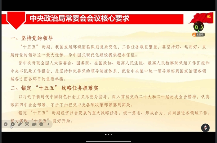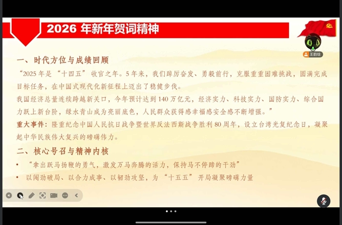 本次会议聚焦三项内容:学习《国家主席习近平二〇二六年新年贺词》、中央政治局常委会会议精神和中央政治局民主生活会精神。 首先,王韵琀同志带领大家对《国家主席习近平二〇二六年新年贺词》进行学习。贺词总结了“十四五”时期在经济、科技、文化、民生等领域取得的辉煌成就,并为“十五五”开局之年的工作指明了方向。