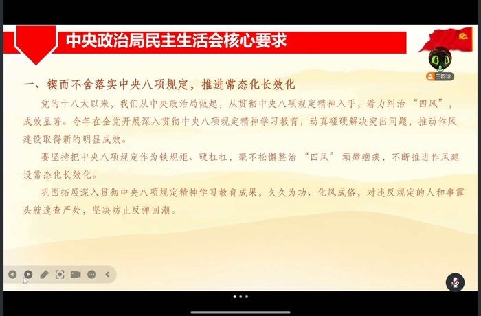 随后,会议学习了中央政治局常委会会议和民主生活会的核心要求。同志们深刻认识到,必须坚持党的领导这一最大优势,锚定“十五五”战略任务抓落实。要锲而不舍落实中央八项规定精神,树立和践行正确政绩观,持续整治形式主义为基层减负,以彻底的自我革命精神高质量完成党中央交办的各项任务。