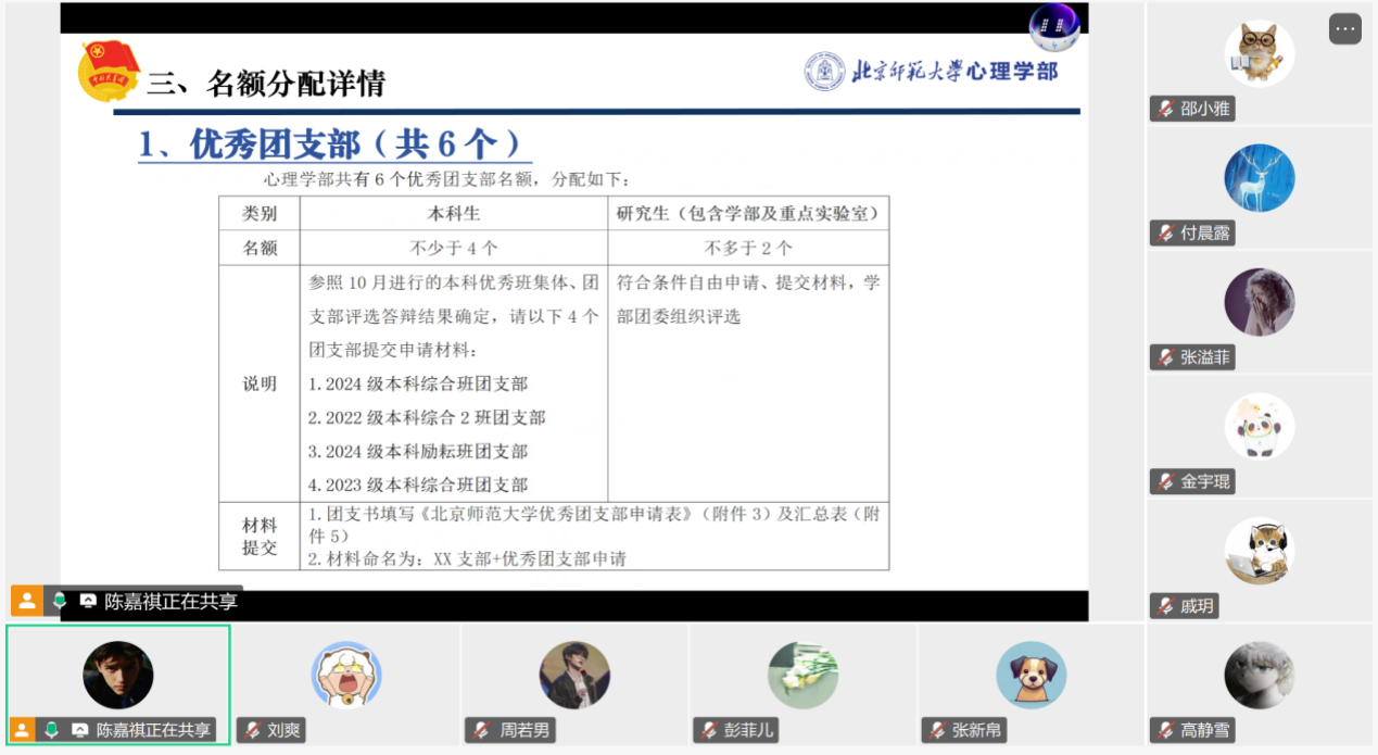 2025年11月28日晚20时,心理学部团委线上召开了2025-2026学年第二次团支书大会。会议由团委组织部部长陈嘉祺主持,心理学部应到团支书28人,实到团支书14人。 本次会议聚焦于2024-2025学年共青团优秀集体及个人的评选工作,旨在通过公正的评选机制,表彰过去一年中表现突出的团支部与个人,进一步激发团学组织的活力。