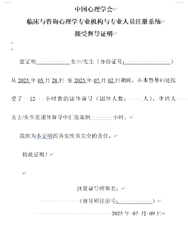 九、督导费用 1800元/人。 十、缴费账号 1. 线上缴费。 登录缴费平台:https://jpc.bnu.edu.cn/cms/jxjy/index.htm,登录后查找【临床与咨询团督活动】进行缴费。(需开发票的学员推荐使用此平台进行缴费) 2. 银行对公转账账号。【可通过手机银行、支付宝、微信等转入如下账户】 开户行:中国银行北京文慧园支行 账户名:北京师范大学 账号:340256015272 银行名称:中国银行 纳税人识别号:12100000400010056C 地址:北京市海淀区新街口外大街19号 注:转账请务必在留言中注明:【团督活动+姓名】,并保留好转账凭据以备核对账目。 缴费截止时间:2025年5月23日17:00 3. 发票 发票内容:函大电大夜大及短期培训费 发票类型:中央财政中央非税收入统一票据 发票形式:电子发票 发放方式:发送至报名者提供的邮箱 十一、证书 全程参与并完成学时的学员奖获得中国心理学会临床与咨询心理学专业机构和专业人员注册系统认证督导师的督导小时数证明。证书样式如下: